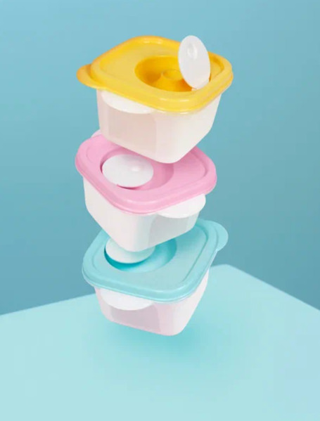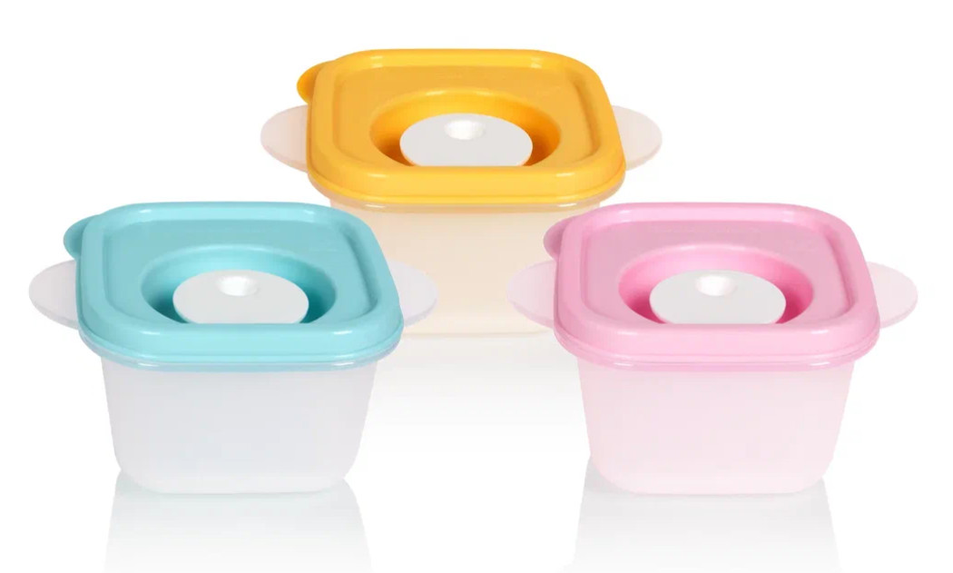 В набор входят 3 ёмкости разного цвета. Каждая ёмкость набора от Tupperware имеет квадратную форму, к каждой прилагается герметичная крышка.