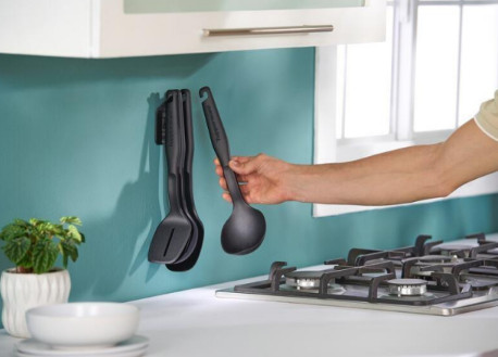 Держатель - Благодаря держателю и клейкой ленте Набор кухонных приборов «Компакт Про» можно повесить на стену. Для этого наклейте двойную клейкую ленту на держатель с двух сторон и закрепите на стене. С помощью крючков, расположенных на кухонных приборах, разместите их на держателе.