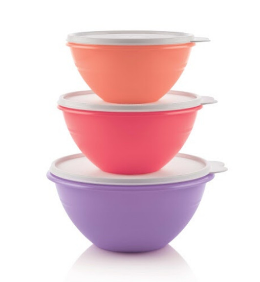 - Три миски объёмом 775мл., 1,2л., 1,75л. и 3 крышки.