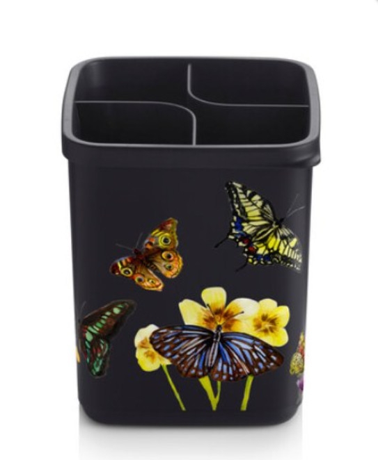 Подставка под столовые приборы выполнена в черном цвете с ярко-бирюзовой вставкой. Она гармонично дополняет серию кухонных приборов «Диско».