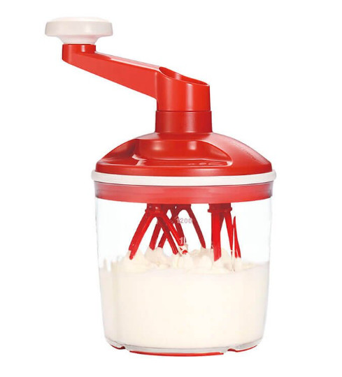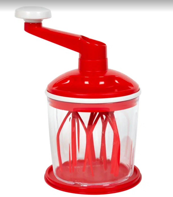 Миксер "От Шефа", размерами 14,4 см x 18,9 см x 26,2 см, состоит из прозрачного основания цилиндрической формы, объемом 1,35 л, и сборной верхней частью, состоящей из прикрывающей крышки 4 класса, вращающейся ручки и трех венчиков для взбивания. Изделие выполнено в красном цвете.